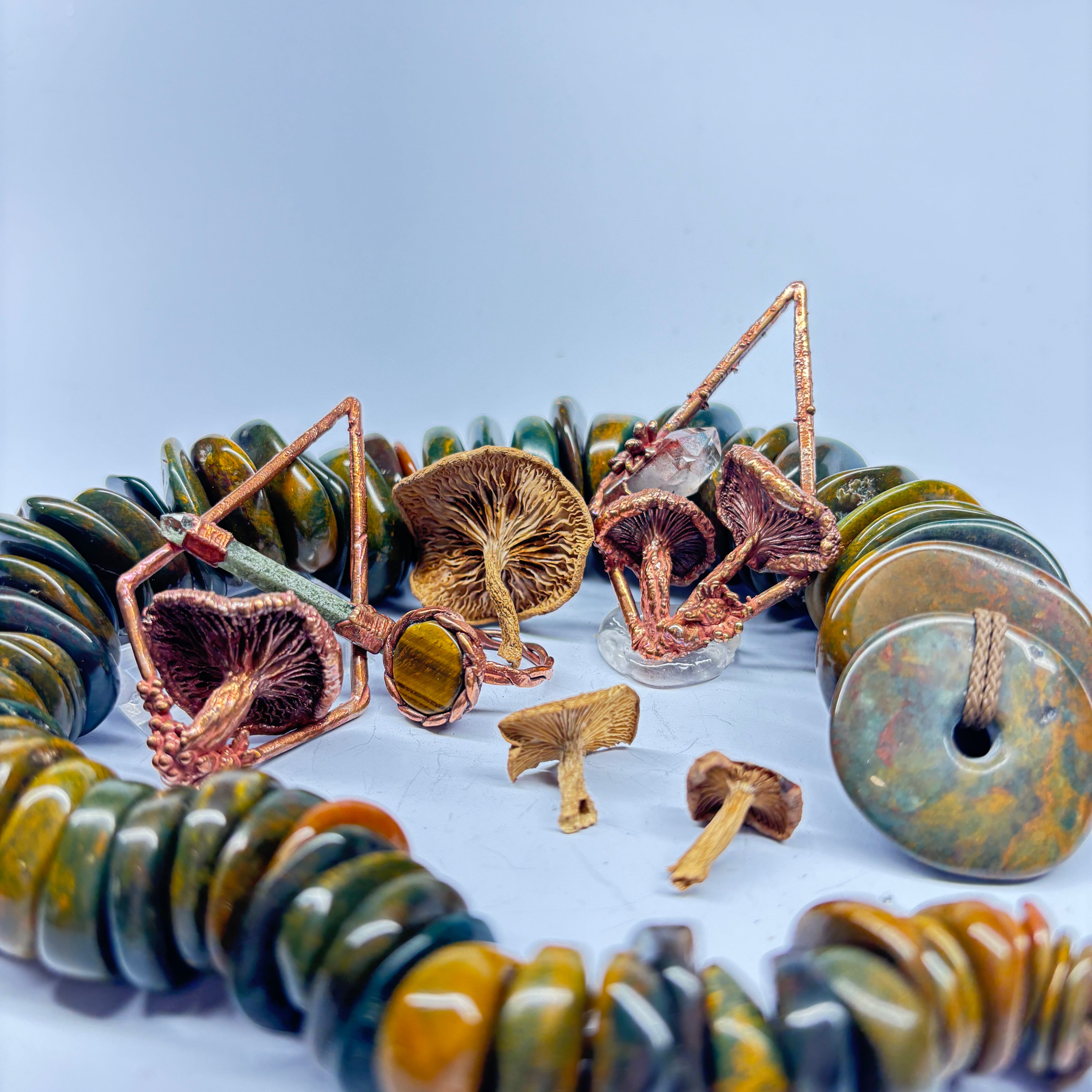 No molds, no mass production. These pendants feature actual dried mushrooms, foraged in the PNW. Each fungi is lovingly electroformed in copper to preserve it's unique beauty.