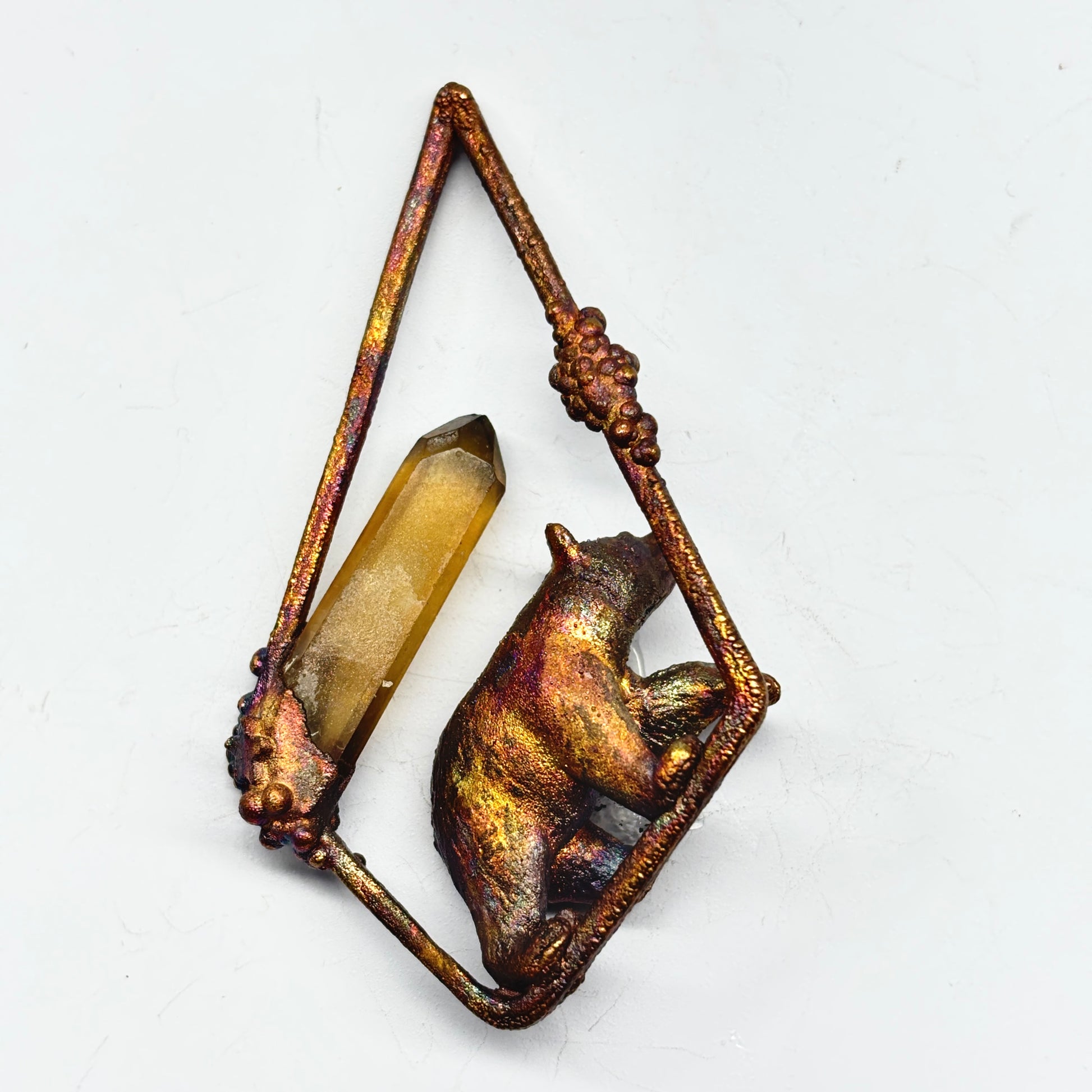 This pendant features a tiny copper bear, a powerful and nurturing presence in nature. The bear inspires courage and strength while reminding you to find balance between your fierce and gentle sides.