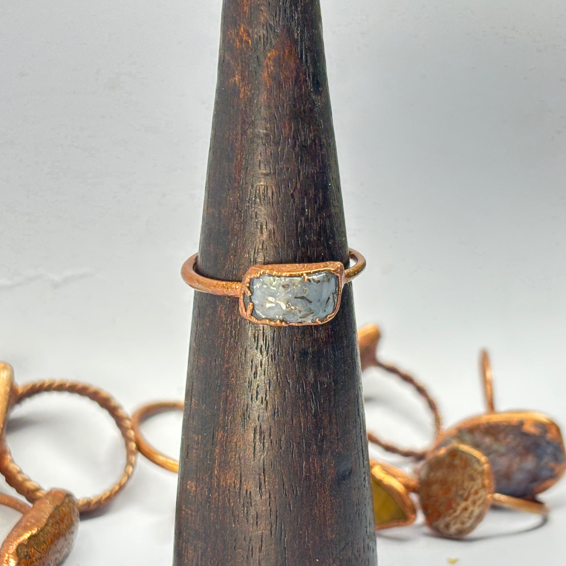 Our copper rings are truly unique, showcasing a wide array of materials, many of which are locally sourced in the PNW. Each piece is crafted using an electroforming technique that allows the copper to grow organically around the stone, creating natural-looking forms that are as distinctive as the wearer. These whimsical yet classy rings are perfect for everyday wear, adding a touch of nature-inspired elegance to any outfit.