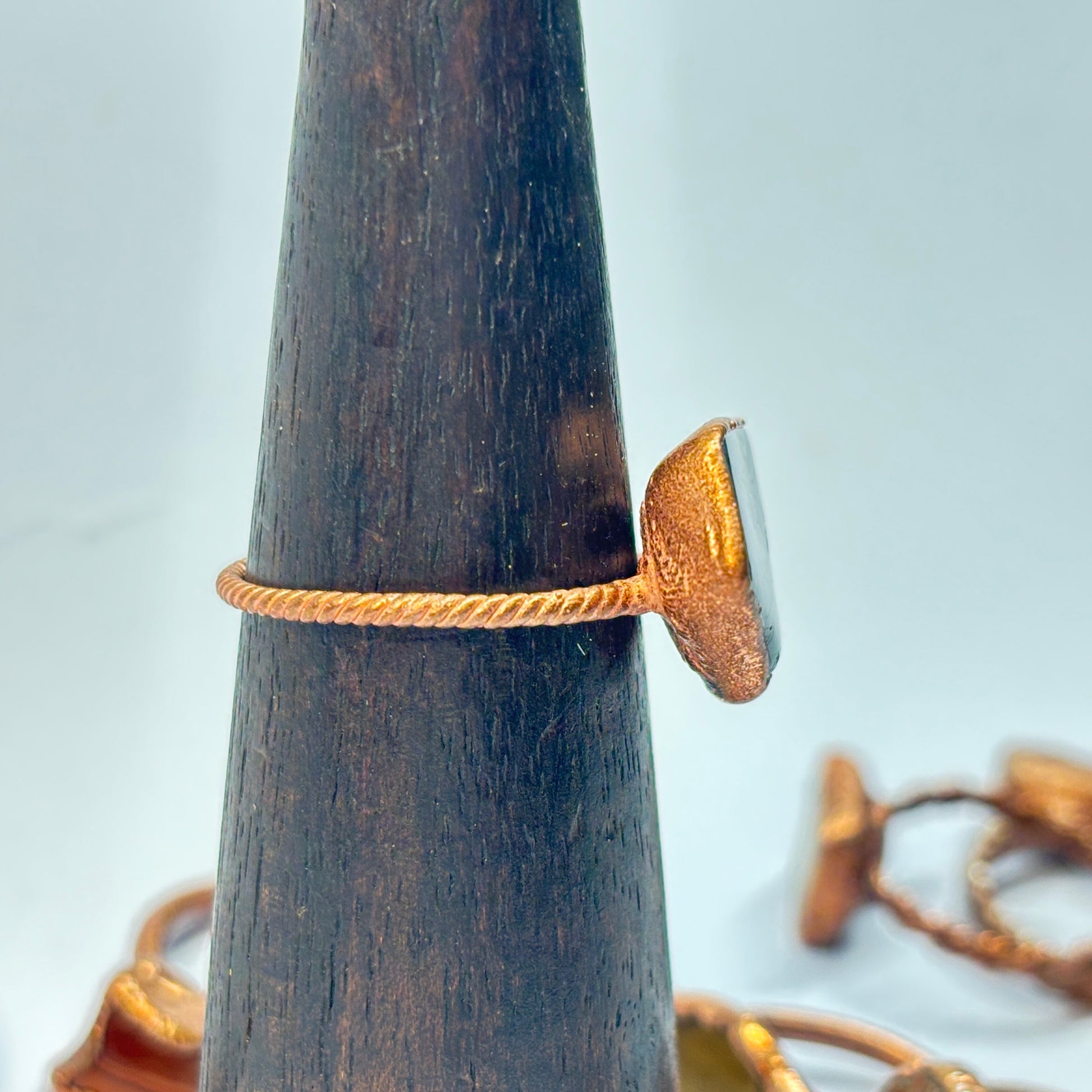 Our copper rings are truly unique, showcasing a wide array of materials, many of which are locally sourced in the PNW. Each piece is crafted using an electroforming technique that allows the copper to grow organically around the stone, creating natural-looking forms that are as distinctive as the wearer. These whimsical yet classy rings are perfect for everyday wear, adding a touch of nature-inspired elegance to any outfit.