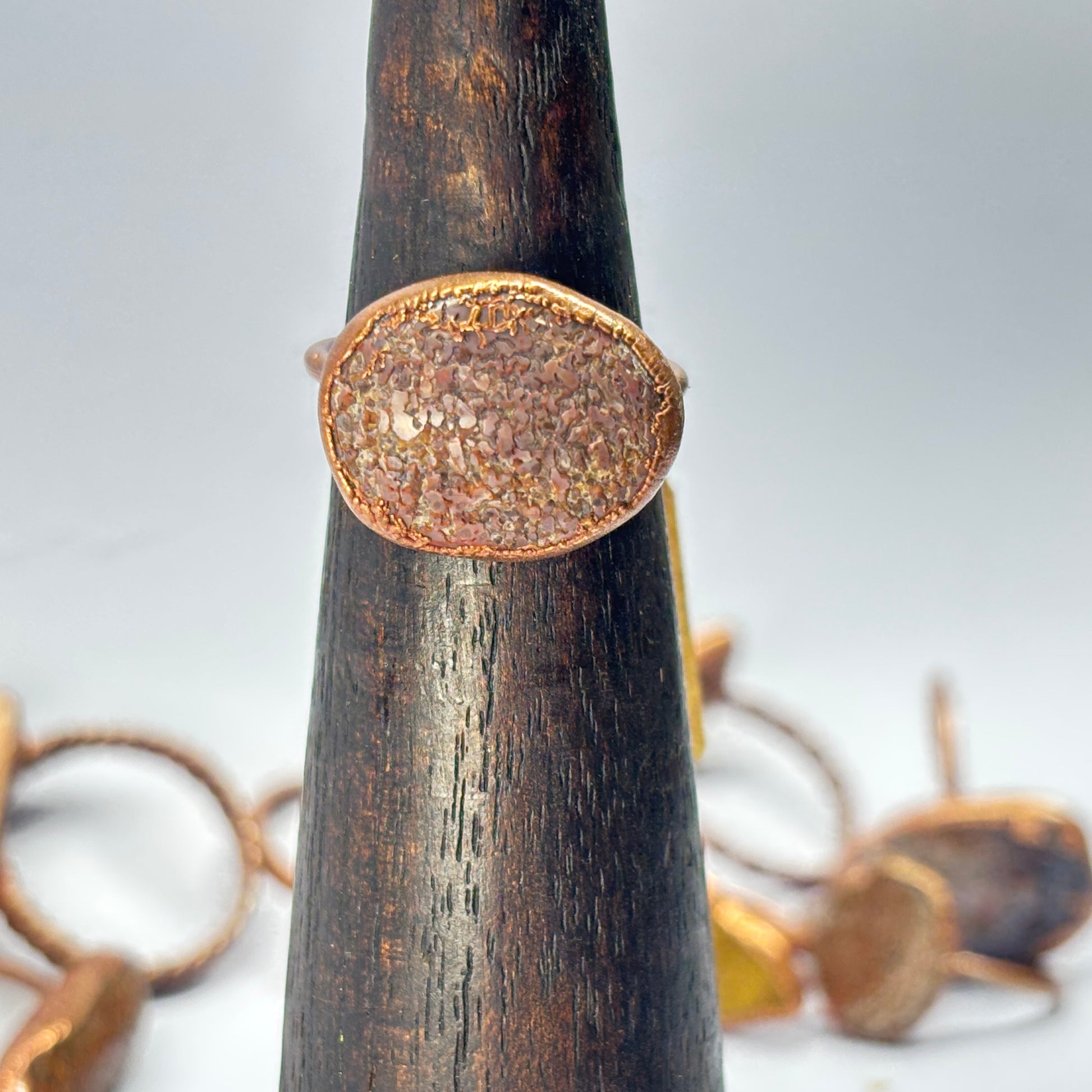 Our copper rings are truly unique, showcasing a wide array of materials, many of which are locally sourced in the PNW. Each piece is crafted using an electroforming technique that allows the copper to grow organically around the stone, creating natural-looking forms that are as distinctive as the wearer. These whimsical yet classy rings are perfect for everyday wear, adding a touch of nature-inspired elegance to any outfit.