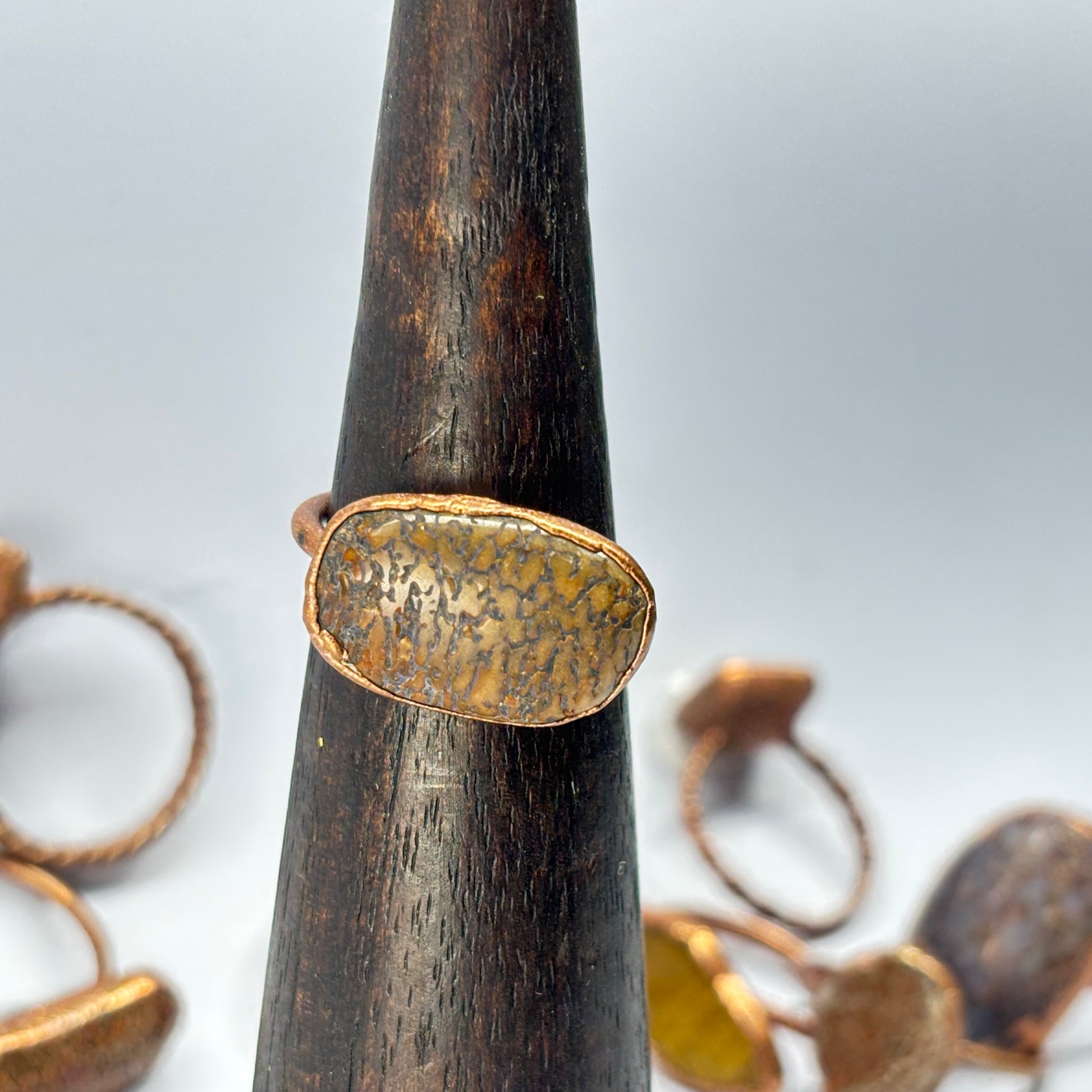 Our copper rings are truly unique, showcasing a wide array of materials, many of which are locally sourced in the PNW. Each piece is crafted using an electroforming technique that allows the copper to grow organically around the stone, creating natural-looking forms that are as distinctive as the wearer. These whimsical yet classy rings are perfect for everyday wear, adding a touch of nature-inspired elegance to any outfit.