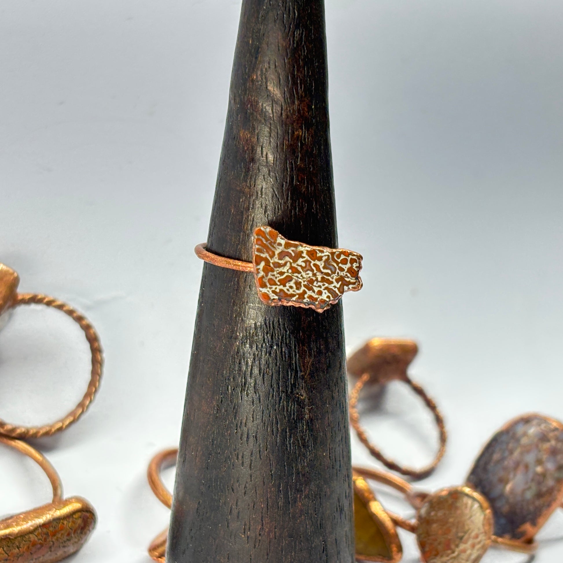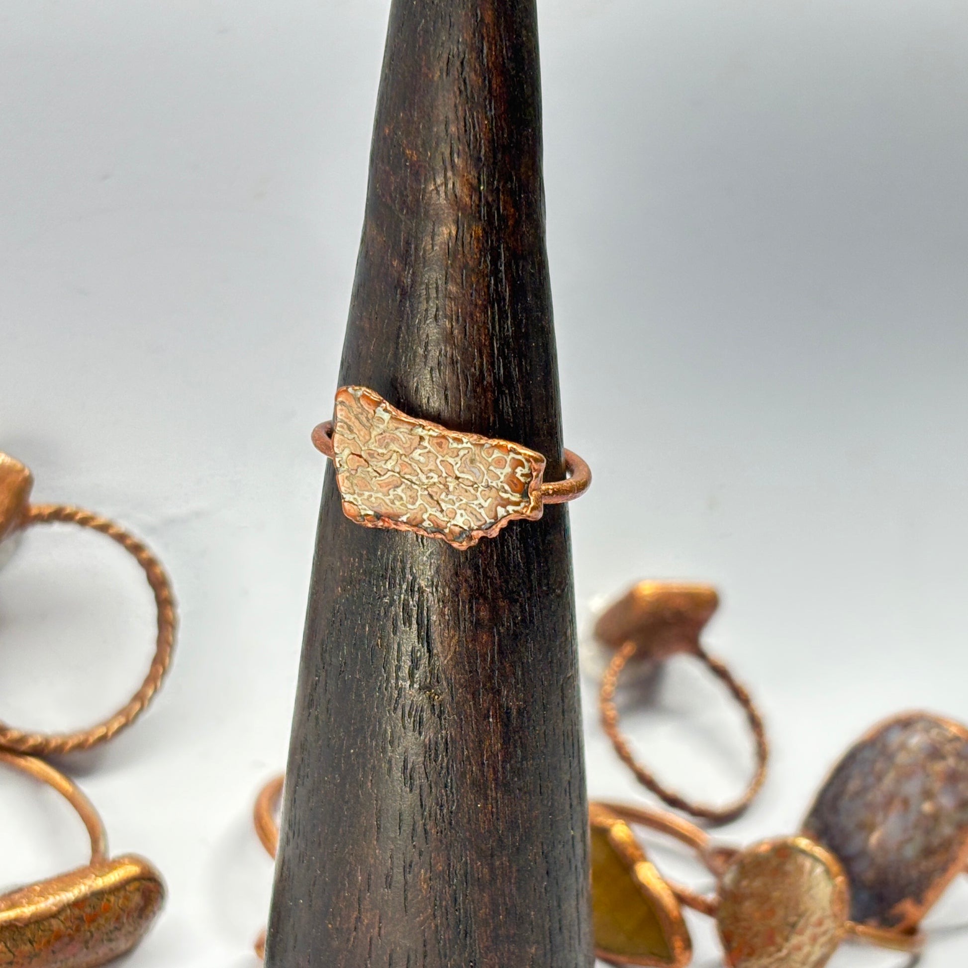 Our copper rings are truly unique, showcasing a wide array of materials, many of which are locally sourced in the PNW. Each piece is crafted using an electroforming technique that allows the copper to grow organically around the stone, creating natural-looking forms that are as distinctive as the wearer. These whimsical yet classy rings are perfect for everyday wear, adding a touch of nature-inspired elegance to any outfit.